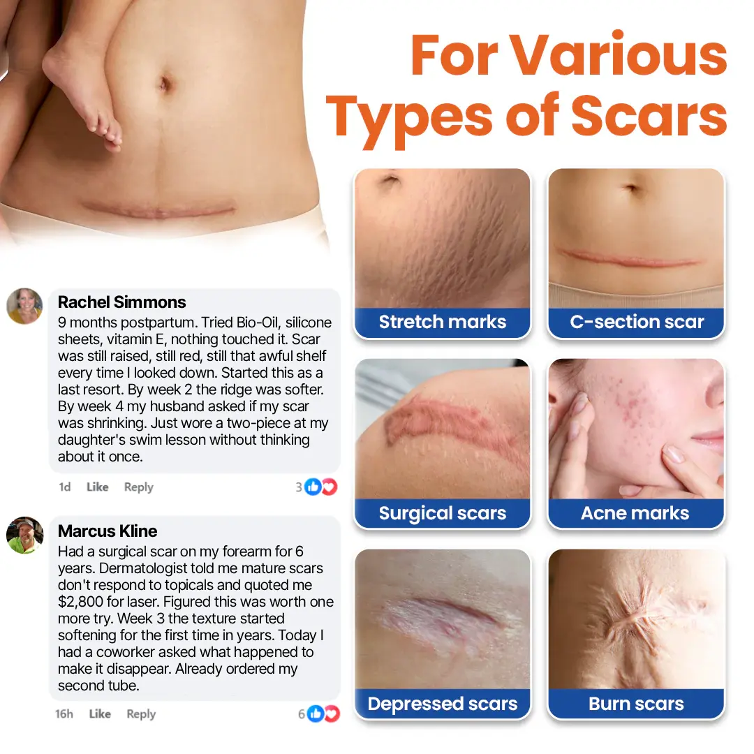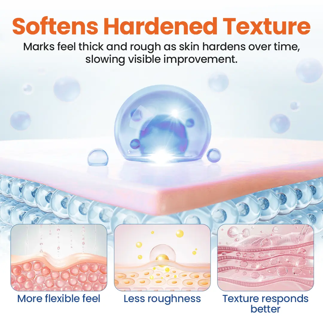 Targets scar tissue and uneven collagen to soften texture, reduce roughness, and help marks blend with surrounding skin over weeks of daily use.